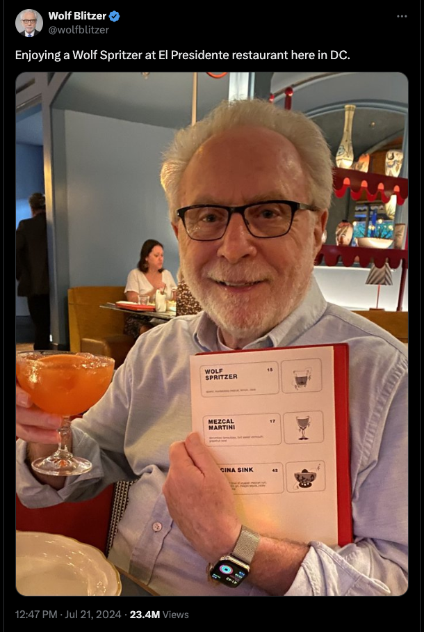 Wolf had ventured into El Presidente, a Mexican restaurant that had opened last September, to try his almost namesake, The Wolf Spritzer. This punny take on a traditional Aperol Spritzer subs out the Aperol for mezcal and uses a sparkling wine in lieu of prosecco and soda water. How did the 76-year-old CNN staffer enjoy it? Well, that is hard to say, as just an hour later, President Joe Biden would announce he had decided to bow out of the presidential race.